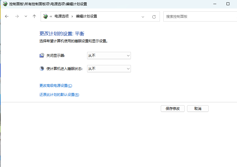 打开控制面板 找到电源选项 更改计划设置 关闭显示器和使用计算机进入睡眠状态都设置 从不,下图所示